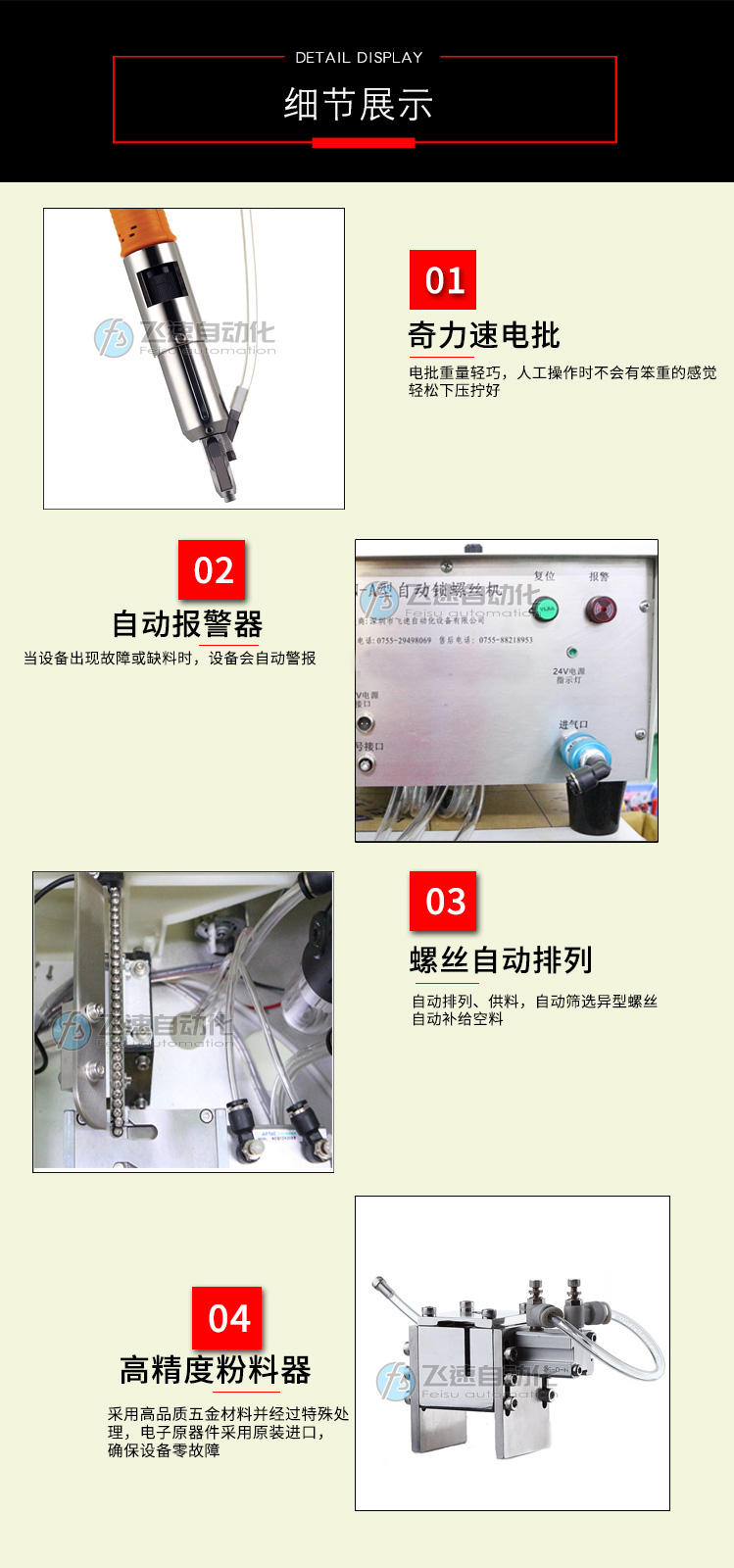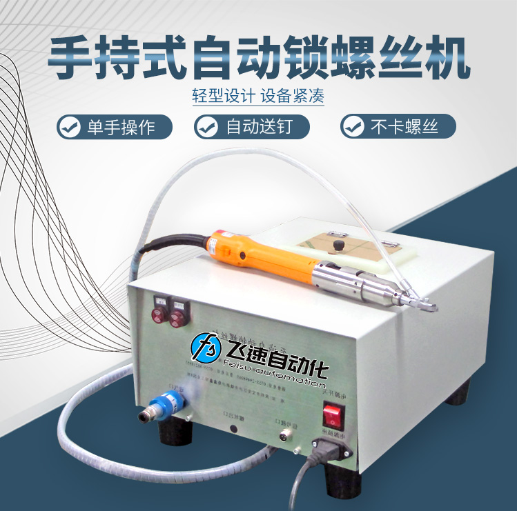 手持式螺絲機(jī)使用方法 深圳市飛速自動化設(shè)備有限公司專注自動鎖螺絲設(shè)備生產(chǎn)設(shè)計,擁有臺灣進(jìn)口CNC、自動化數(shù)控設(shè)備、鉆床、銑床、線切割、精密自動車床等加工機(jī)設(shè)備50多臺套,是一家集方案設(shè)計、研發(fā)、制造、加工為一體的實(shí)力生產(chǎn)商。近年來為適應(yīng)企業(yè)自動化生產(chǎn)需求,公司研發(fā)多種系列自動化鎖螺絲設(shè)備,廣泛用于通信、電子、電器、電腦、燈飾、玩具、建材、汽車等制造業(yè)。 熊先生:13923485762